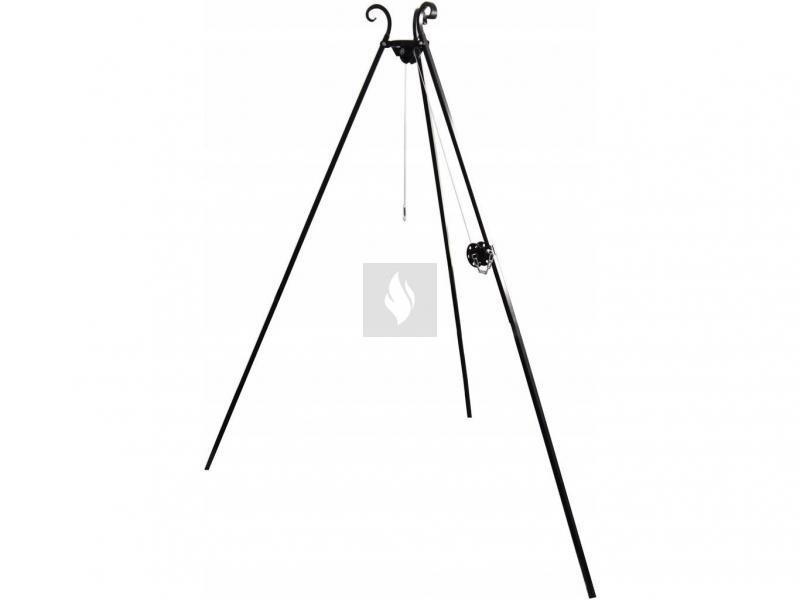 Háromlábú tűzállvány csörlővel, kb. 180 cm-es teljes magassággal, 12 kg tömeggel, kültéri bográcsozáshoz és függesztett főzéshez.