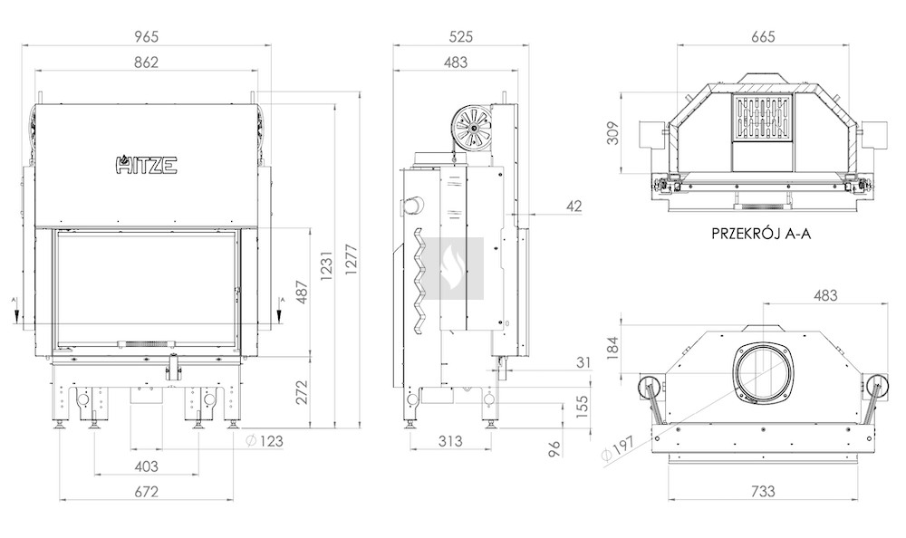 A kerámia betét felhalmozza a hőt és akár 1000°C-ig ellenáll a hőmérsékletnek. A klasszikus hatszögletű égéstér kisebb mérete magasabb égési hőmérsékletet eredményez. A rács és a hamutálca megkönnyíti a hamu eltávolítását és a fa maradványainak összegyűjtését. Az AL120x43 modell kivételével, amely nem rendelkezik ráccsal.