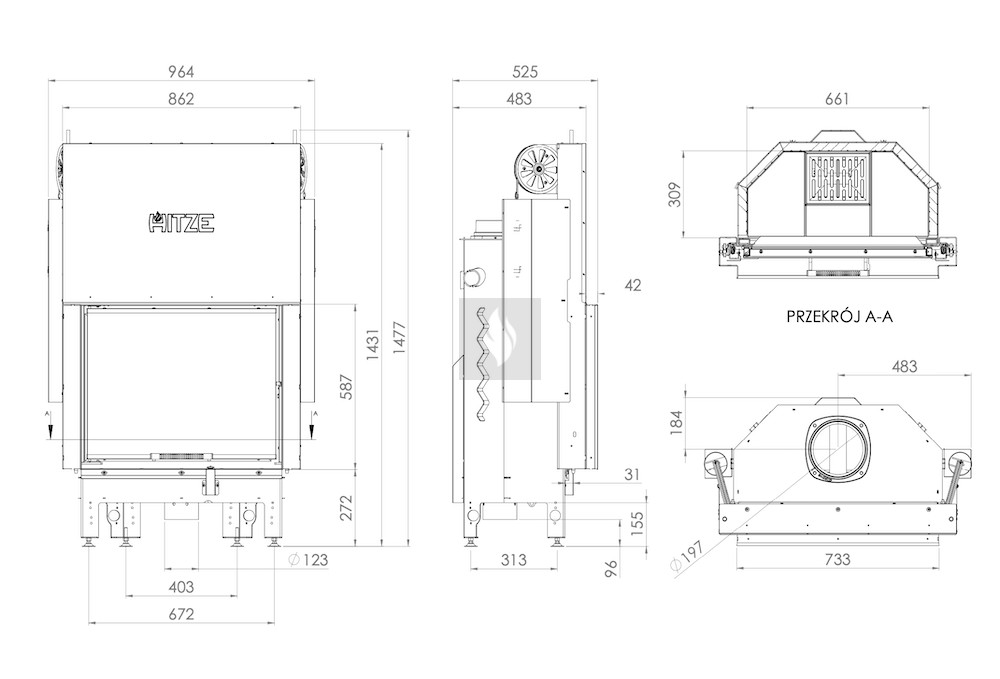 A kerámia betét felhalmozza a hőt és akár 1000°C-ig ellenáll a hőmérsékletnek. A klasszikus hatszögletű égéstér kisebb mérete magasabb égési hőmérsékletet eredményez. A rács és a hamutálca megkönnyíti a hamu eltávolítását és a fa maradványainak összegyűjtését. Az AL120x43 modell kivételével, amely nem rendelkezik ráccsal.