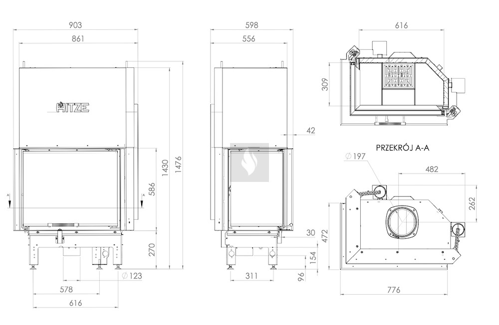 A kerámia betét felhalmozza a hőt és akár 1000°C-ig ellenáll a hőmérsékletnek. A klasszikus hatszögletű égéstér kisebb mérete magasabb égési hőmérsékletet eredményez. A rács és a hamutálca megkönnyíti a hamu eltávolítását és a fa maradványainak összegyűjtését. Az AL120x43 modell kivételével, amely nem rendelkezik ráccsal.