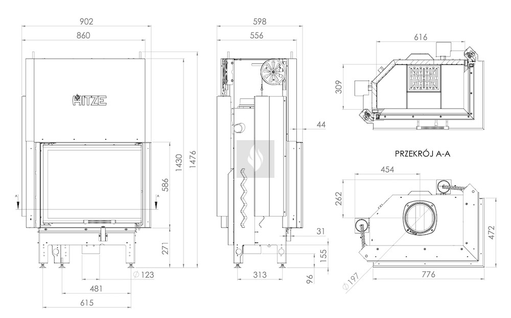 A kerámia betét felhalmozza a hőt és akár 1000°C-ig ellenáll a hőmérsékletnek. A klasszikus hatszögletű égéstér kisebb mérete magasabb égési hőmérsékletet eredményez. A rács és a hamutálca megkönnyíti a hamu eltávolítását és a fa maradványainak összegyűjtését. Az AL120x43 modell kivételével, amely nem rendelkezik ráccsal.