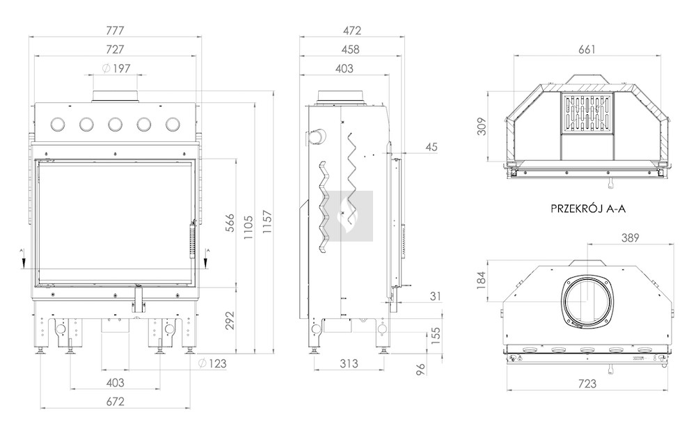 A kerámia betét felhalmozza a hőt és akár 1000°C-ig ellenáll a hőmérsékletnek. A klasszikus hatszögletű égéstér kisebb mérete magasabb égési hőmérsékletet eredményez. A rács és a hamutálca megkönnyíti a hamu eltávolítását és a fa maradványainak összegyűjtését. Az AL120x43 modell kivételével, amely nem rendelkezik ráccsal.