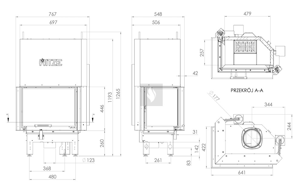 A kerámia betét felhalmozza a hőt és akár 1000°C-ig ellenáll a hőmérsékletnek. A klasszikus hatszögletű égéstér kisebb mérete magasabb égési hőmérsékletet eredményez. A rács és a hamutálca megkönnyíti a hamu eltávolítását és a fa maradványainak összegyűjtését. Az AL120x43 modell kivételével, amely nem rendelkezik ráccsal.