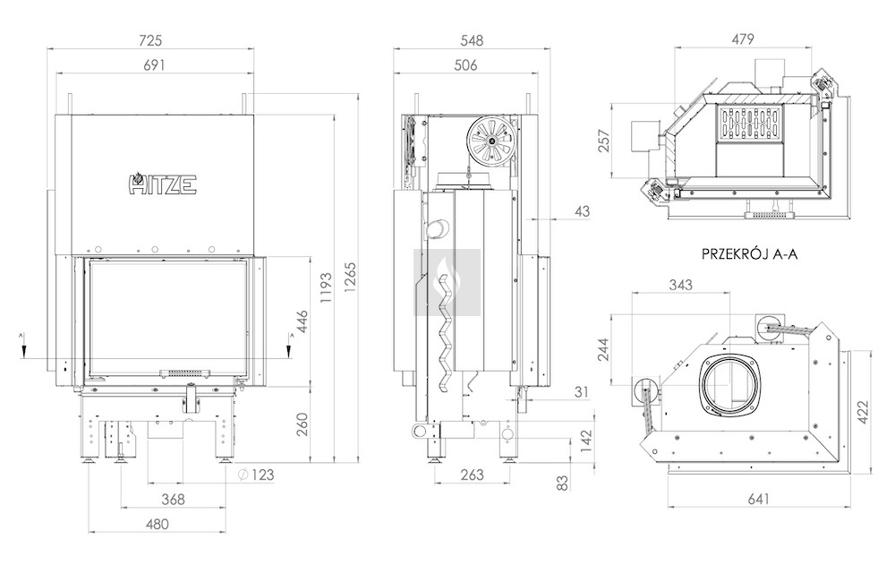 A kerámia betét felhalmozza a hőt és akár 1000°C-ig ellenáll a hőmérsékletnek. A klasszikus hatszögletű égéstér kisebb mérete magasabb égési hőmérsékletet eredményez. A rács és a hamutálca megkönnyíti a hamu eltávolítását és a fa maradványainak összegyűjtését. Az AL120x43 modell kivételével, amely nem rendelkezik ráccsal.