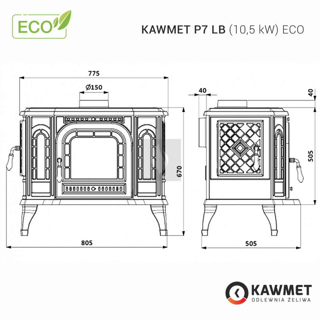 A KAWMET P7 LB (10,5 kW) ECO öntvény kandallókályha egy klasszikus öntvény kandallókályha az ECO sorozatból. Ennek a KAWMET öntvény kandallókályhának számos előnye van, amelyek közül a legfontosabb a környezetbarát tervezési követelményeknek való megfelelés, a tökéletes kialakítás és a nagy teljesítmény.