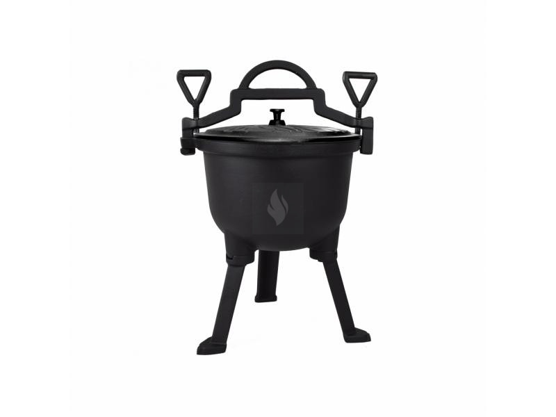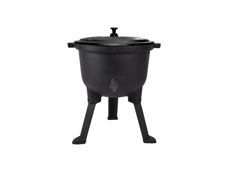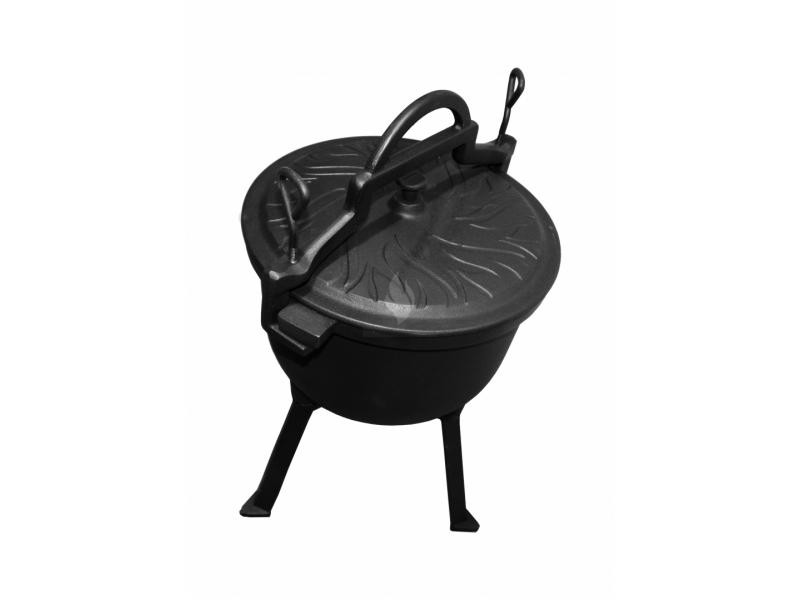 10 literes öntöttvas bogrács 34×39,5×59 cm mérettel, 30,5 cm belső átmérővel, 22,5 cm belső mélységgel és 49 cm láb nélküli magassággal. Anyaga öntöttvas, tömege 19 kg.