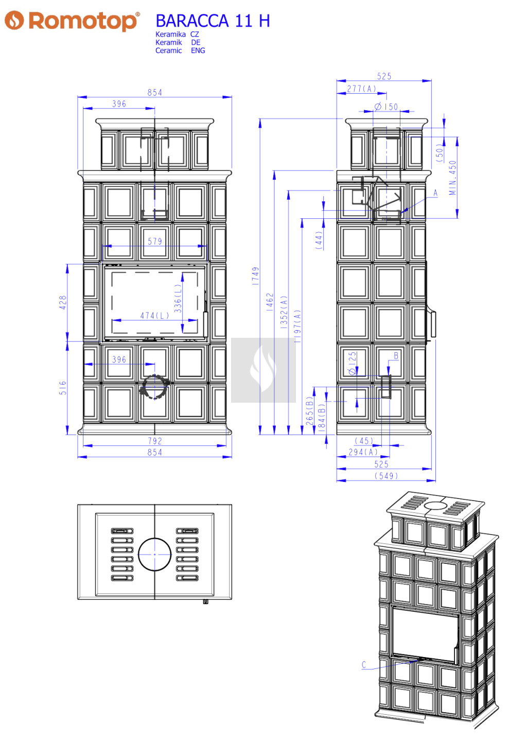 Romotop BARACCA 11 H kályhacsempe burkolatú kandallókályha - bővíthető hőtárolóval