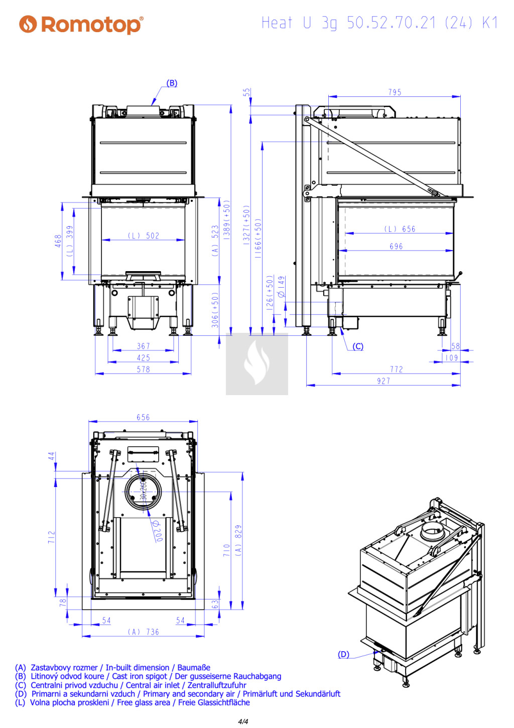 Romotop HEAT U 3G L 50.52.70.26 Légfűtéses kandallóbetét fekete béléssel
