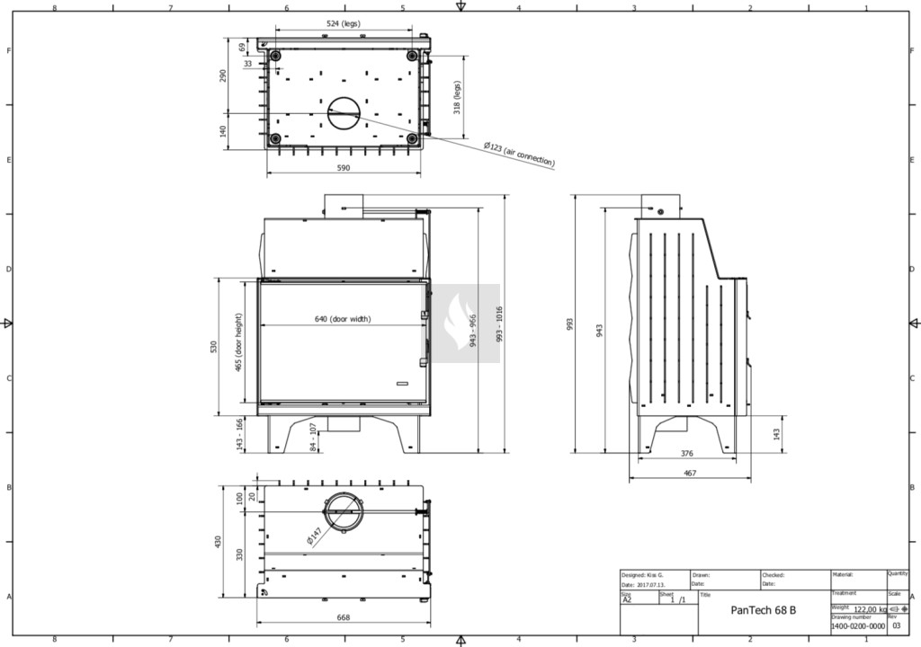 Firetechnic PanTech 68 B Légfűtéses kandallóbetét, Oldalra nyíló ajtóval. Üvegezés típusa: Síküveges. 8,0 kW névleges teljesítménnyel.