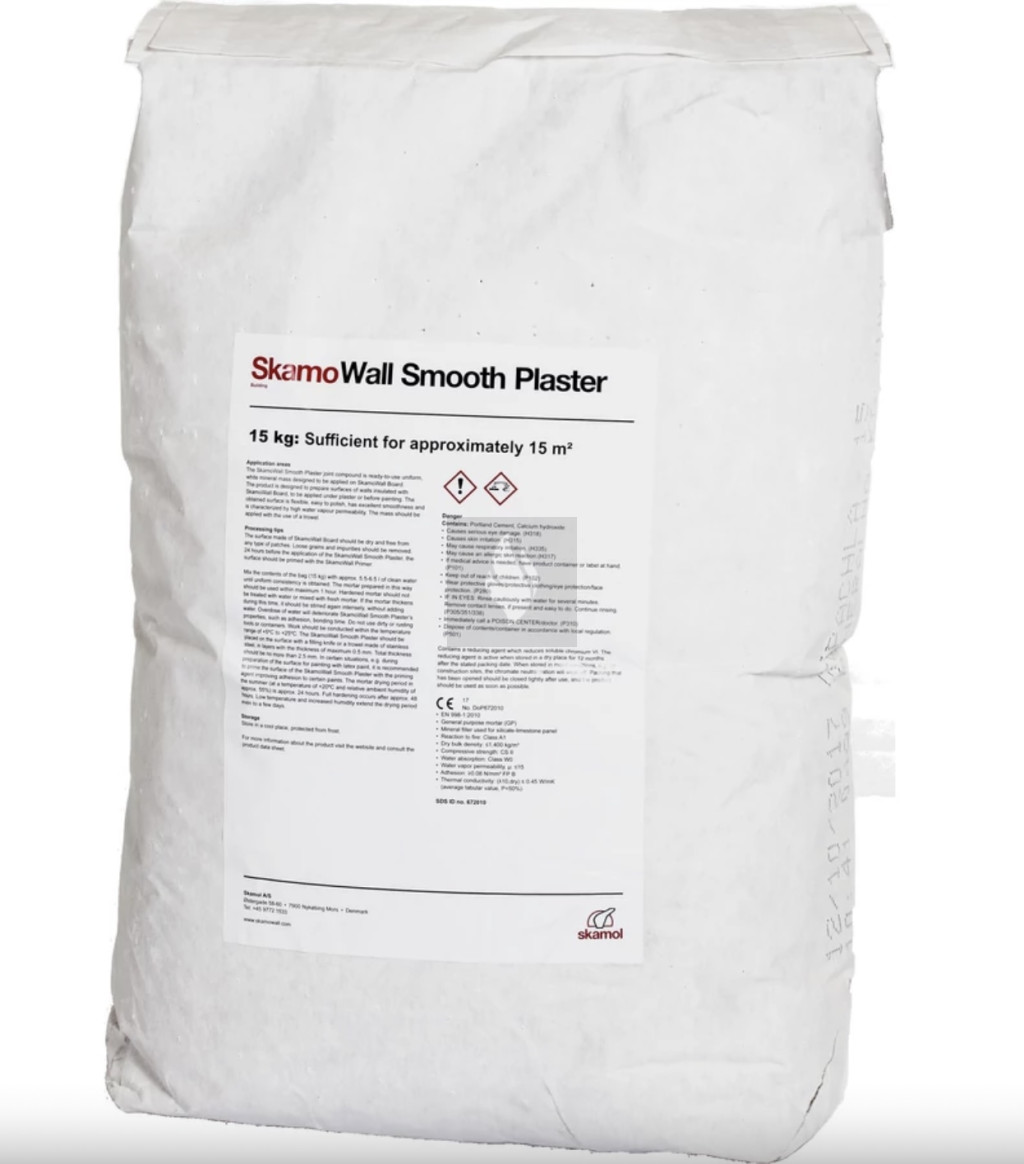 A Skamol finom vakolat 15kg a kandallók körüli falfelületek festés előtti előkészítésére szolgál, és a legtöbb beltéri diszperziós festékkel kiválóan együtt használható. A felület a felhordás után rugalmas, könnyen csiszolható, és igény esetén üvegszálas háló is beágyazható a rétegbe a nagyobb szilárdság érdekében. A vakolat simítóval vihető fel, alkalmazása előtt pedig ajánlott az aljzatot Skamol alapozóval kezelni. Összetétele cementet, meszet, ásványi töltőanyagokat és javítóadalékokat tartalmaz. Nagy teljesítményű, jól tapadó, vízgőzáteresztő és könnyen használható anyag. Száraz, fehér színű keverékként kapható, tűzveszélyességi besorolása A1, ömlesztett sűrűsége legfeljebb 1 400 kg/m³. Egy 15 kg-os zsák 2 mm-es rétegvastagság mellett körülbelül 7,5 m² felületre elegendő, elkészítéséhez 5,5–6,5 liter víz szükséges. A felhasználási hőmérséklet +5 °C és +25 °C között ideális. Vízgőz-átbocsátási értéke µ ≤ 15, tapadása ≥ 0,08 N/mm², hővezető képessége pedig λ10 száraz ≤ 0,45 W/mK.