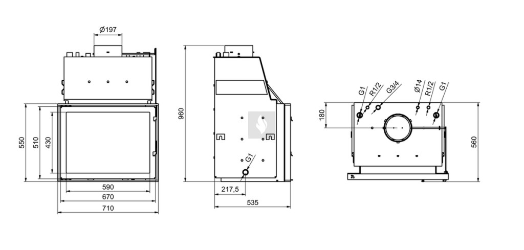 Firetechnic PanAqua 25 Vízteres kandallóbetét, Oldalra nyíló ajtóval. Üvegezés típusa: Síküveges. 25,0 kW névleges teljesítménnyel.