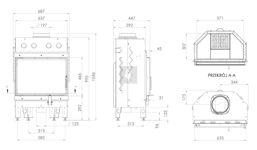 A kerámia betét felhalmozza a hőt és akár 1000°C-ig ellenáll a hőmérsékletnek. A klasszikus hatszögletű égéstér kisebb mérete magasabb égési hőmérsékletet eredményez. A rács és a hamutálca megkönnyíti a hamu eltávolítását és a fa maradványainak összegyűjtését. Az AL120x43 modell kivételével, amely nem rendelkezik ráccsal.