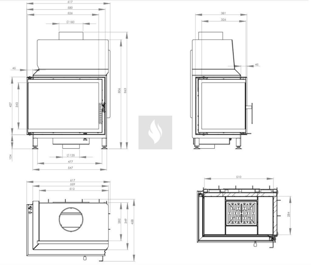 A hőálló kerámiaüveg biztosítja a magas hőmérsékletnek (akár 800°C-ig) való ellenállást, és opcionálisan dupla üvegezési rendszerben is elérhető. Az ø125 mm-es légbevezető nyílás és a betét acél alapja lemezes légfojtóval van ellátva. Az ø180 mm-es öntöttvas füstcső garantálja a kandalló és a kéménycsatorna szoros csatlakozását, biztosítva a megfelelő égést és a hőcsere területének növelését. A rács és a hamutálca megkönnyíti a hamu eltávolítását és a fa maradványainak összegyűjtését.