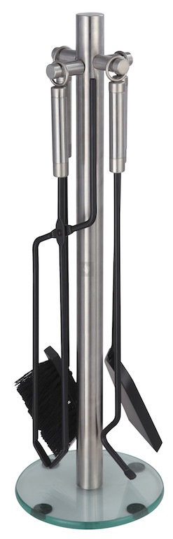 Kandallótisztító szett, acél állványon, edzett üveg talppal, fekete eszközökkel, acél nyéllel.