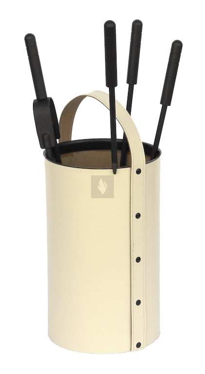 4 részes kandallótisztító készlet, bézs színű, esőálló bőrből. Fekete színű eszközökkel. Az eszközök magassága 60 cm.