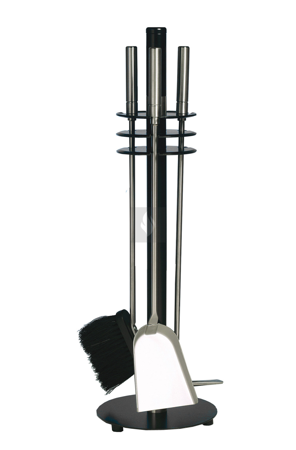 Fekete színű tartó, rozsdamentes acél eszközökkel és nyéllel.