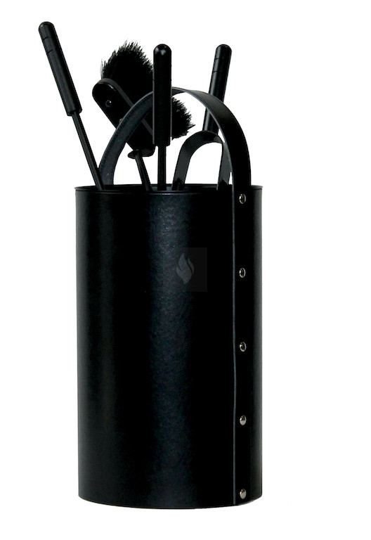 Kör alakú kandallótisztító szett, fekete esőálló bőr anyagból, fekete eszközökkel.