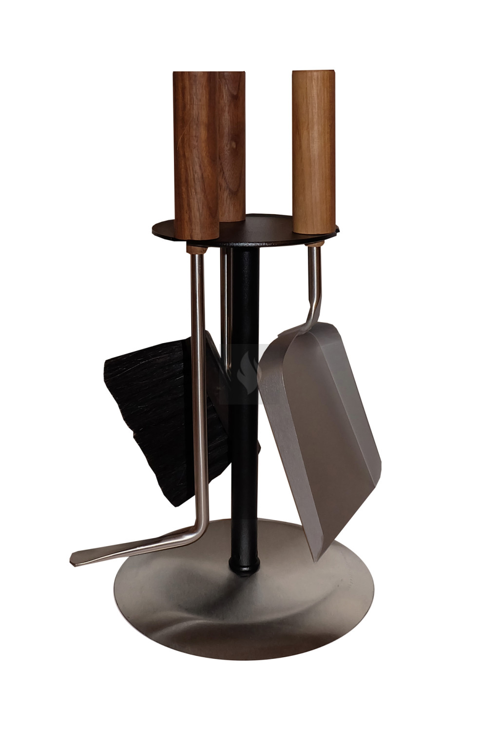 Fekete tartó, rozsdamentes acél eszközökkel, dió nyéllel.